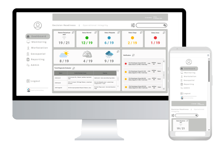 Melalui antarmuka yang tenang dan responsif, semua fungsi utama — monitoring, geospasial, pelaporan, hingga administrasi — terhubung dalam satu ruang kendali yang menjaga kesiapan keputusan dan integritas operasional.